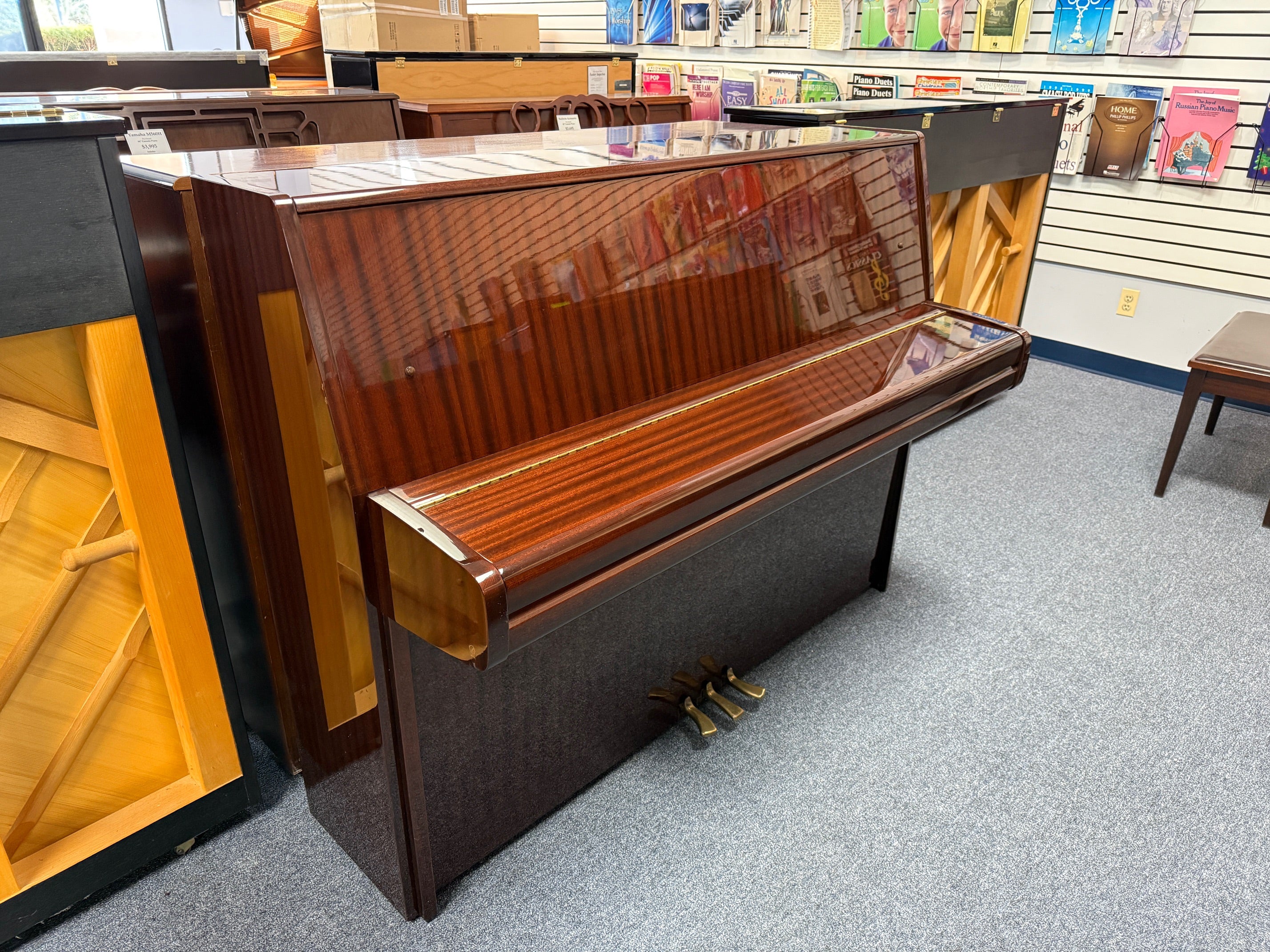 Thank you for viewing the best collection of used pianos for sale in NJ. This 1988 Yamaha P-116 upright piano in polished mahogany is a classic beauty. It's glossy finish offers a timeless allure enhancing any home decor. This P-116 offers a crisp, full tone that resonates with clarity and warmth and a responsive touch that will satisfy the most demanding of players.